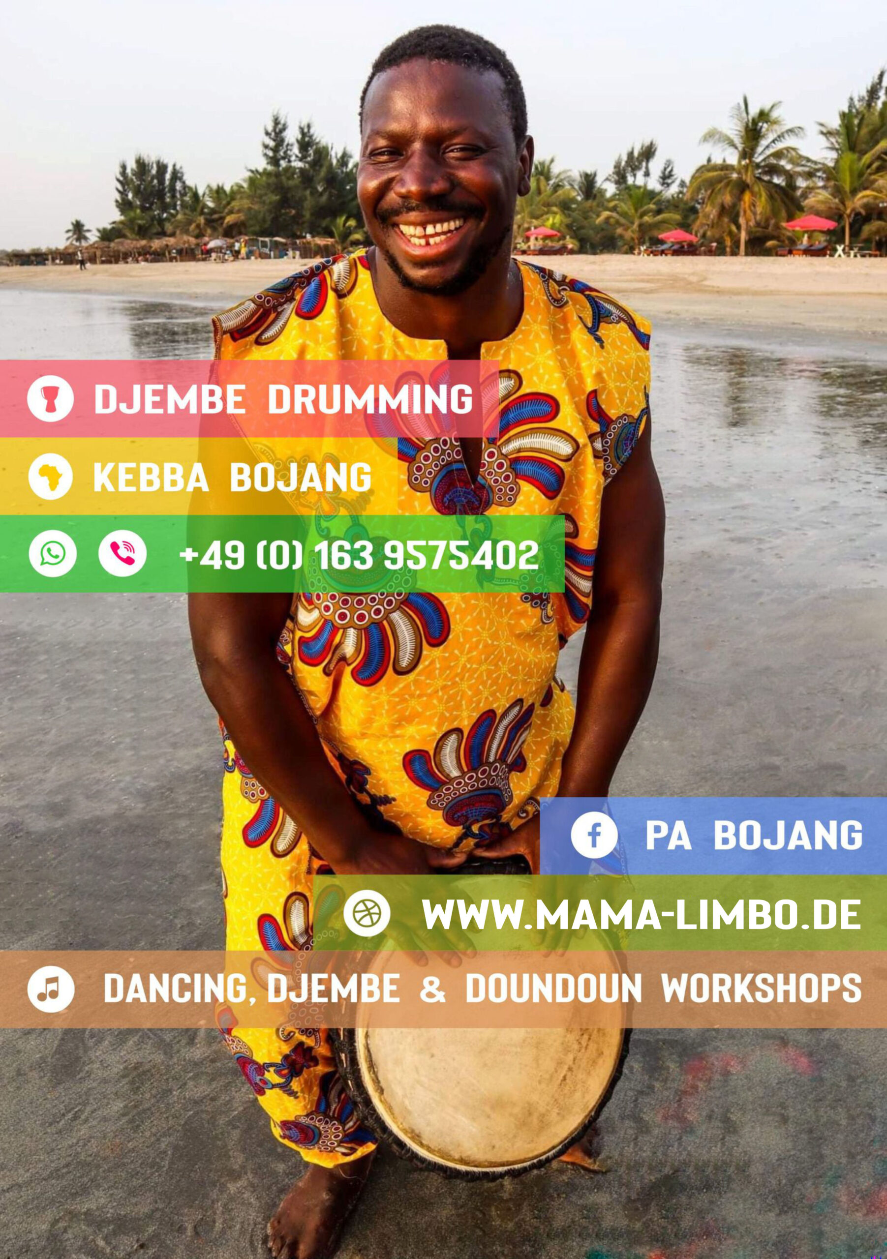 Geleitet wird die „Mama Limbo Cultural Group“ von Kebba Bojang, geb. in Sanyang/Gambia. Seit über 30 Jahren Musiker mit Trommel- und Tanzerfahrung in der traditionellen westafrikanischen Kultur. Zahlreiche Workshops, Projekte und Konzerte im In- und Ausland begleiten seinen bisherigen Werdegang. Zudem Djembefola und VHS Dozent sowie Reparatur & Verkauf von Trommeln mit Rechnung.