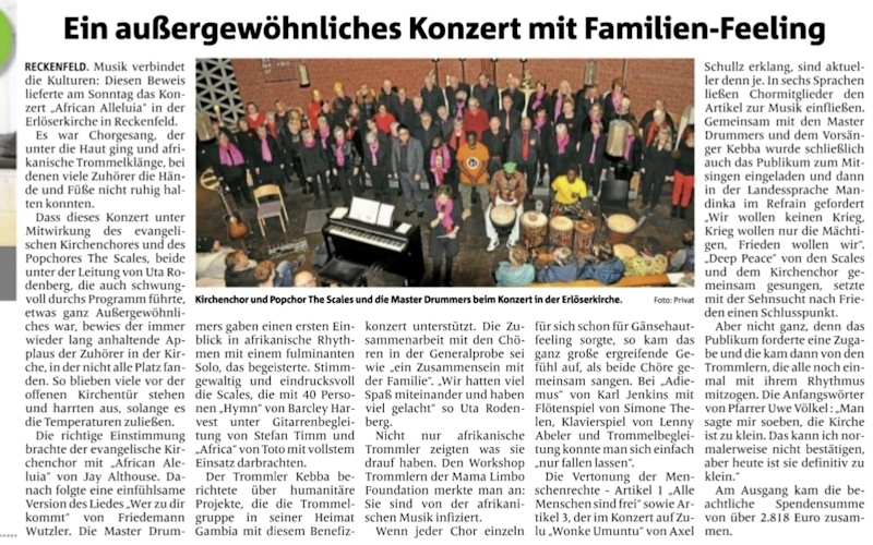 Es war Chorgesang, der unter die Haut ging und afrikanische Trommelklänge, bei denen viele Zuhörer die Hände und Füße nicht ruhig halten konnten. Dass dieses Konzert unter Mitwirkung des evangelischen Kirchenchores und des Popchores The Scales, beide unter der Leitung von Uta Rodenberg, die auch schwungvoll durchs Programm führte, etwas ganz Außergewöhnliches war, bewies…